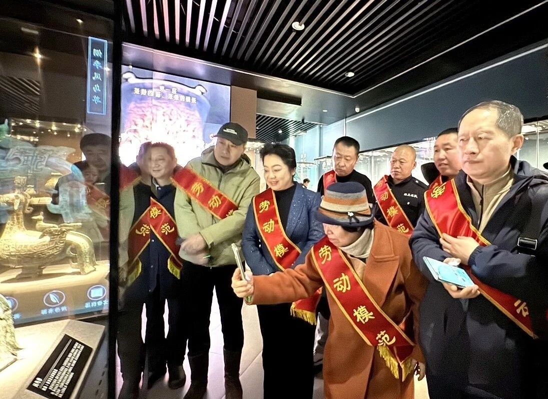 展览共展出海外回流文物76件,包括圆明园兽首7件及商周至两汉时期青铜器59件。在专业讲解员的讲述中,劳模们深入了解了文物背后的流失往事与回归历程,深刻感受了中华民族从磨难到复兴的伟大跨越。自由观展期间,大家频频驻足交流,从文物精妙的铸造工艺到新时代的工匠精神,从国宝回归的动人故事中体悟文化自信的深远意义。