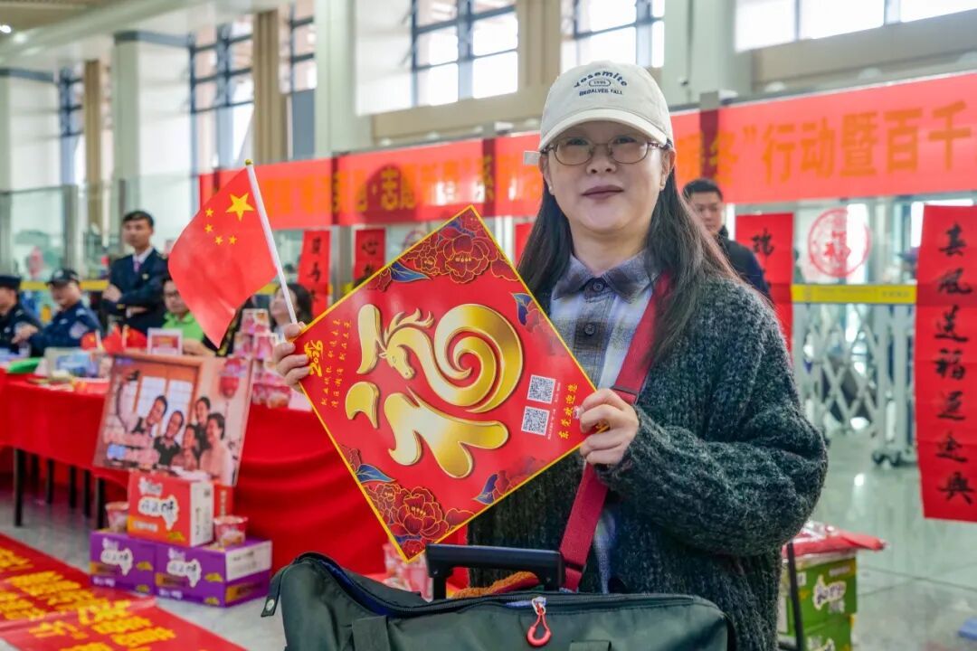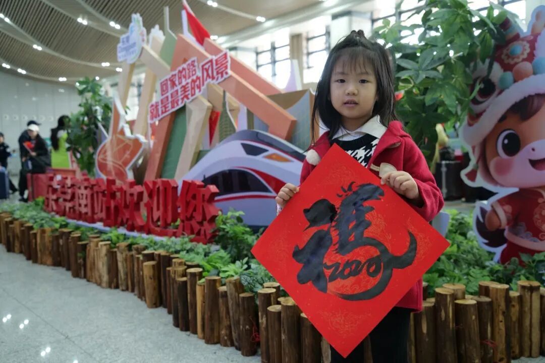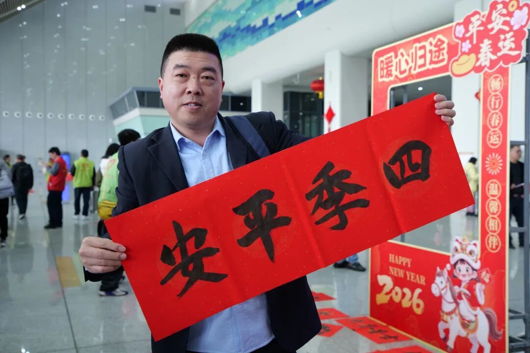 现场的便民服务摊位暖意融融。不仅有工作人员向旅客派发寓意吉祥的“福”字,现场还有写春联、剪窗花、定制红包等民俗体验活动让人眼前一亮,笔墨纸砚一应俱全,旅客们可以亲身感受传统文化的魅力。