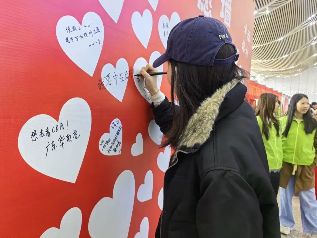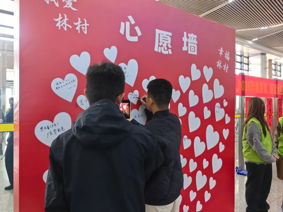 此外,镇宣教文旅办免费为旅客提供矿泉水和手帕纸等暖心物资,送至细致关怀。塘厦人社分局的摊位前为旅客们提供了各类求职指南与咨询服务,为有就业需求的旅客搭建起信息桥梁。站内还设置了主题打卡墙前和心愿墙,旅客们纷纷驻足拍照,书写新年期盼与美好祝愿。